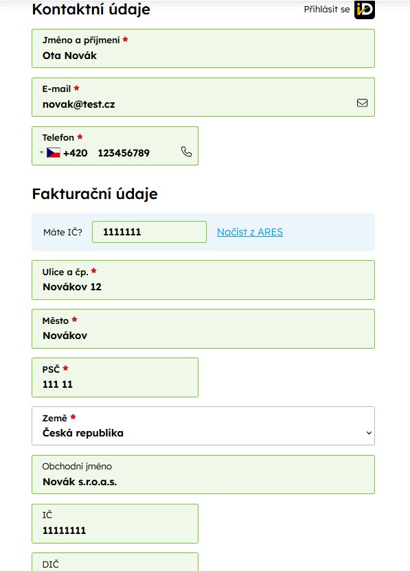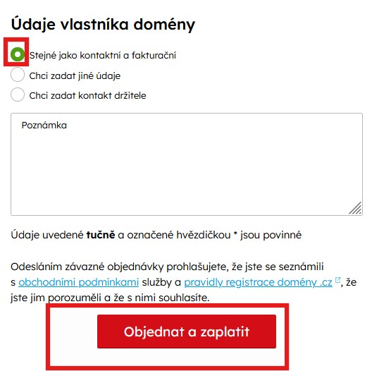 Údaje vlastníka domény zaškrtnete "Stejné jako kontaktní a fakturační" pokud nechcete doménu registrovat na jinou osobu nebo firmu.