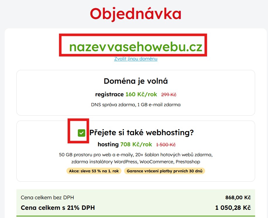 zakoupení domény s hostingem, zaškrtnete položku Přejete si také hosting, nejlepší hosting pro WordPress